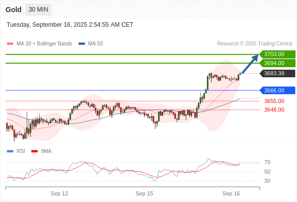 在 3666.00 之上,看涨,目标价位为 3694.00 ,然后为 3703.00 。