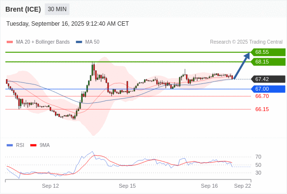 在 67.00 之上,看涨,目标价位为 68.15 ,然后为 68.55 。