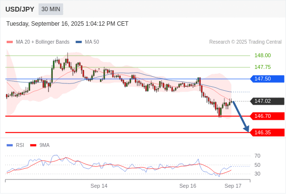 在 147.50 之下,看跌,目标价位为 146.70 ,然后为 146.35 。