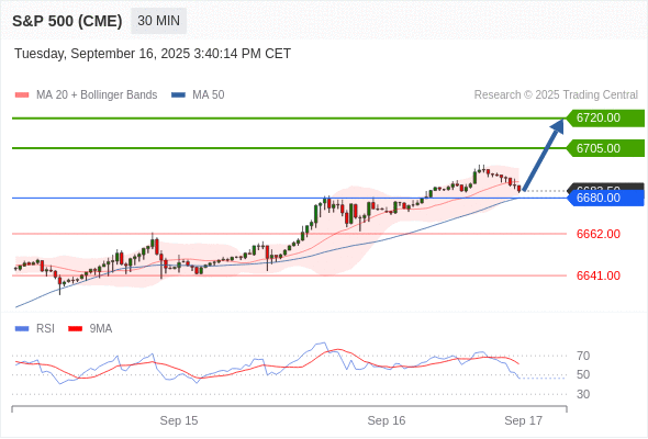 在 6680.00 之上,看涨,目标价位为 6705.00 ,然后为 6720.00 。
