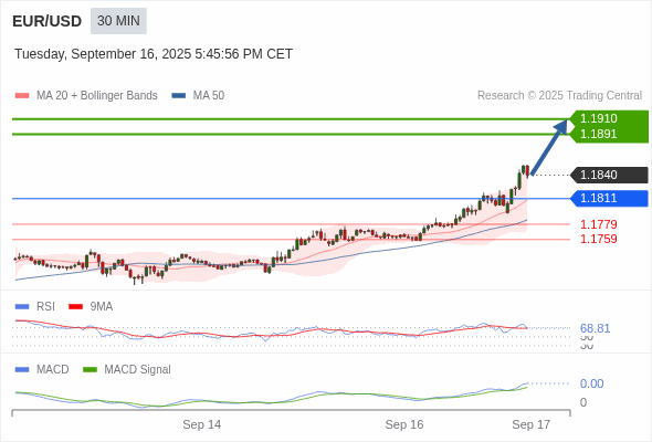 欧元/美元 当日内 : 看涨,当 1.1811 为支撑位。