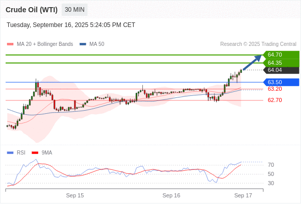 在 63.50 之上,看涨,目标价位为 64.35 ,然后为 64.70 。