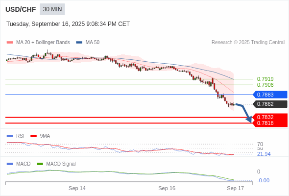 技术点评: RSI技术指标小于30。在这种情况下,说明有很强的下跌趋势,或者意味着处在超卖的状态下,可能会有向上的反弹。我们将观察RSI技术指标是否出现背离现象。 MACD技术指标处在其信号线之下看空。 配置为负。 此外,价位低于其20天及50天移动平均线 ( 分别位于0.7888 和0.7918 )。