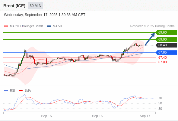 在 67.85 之上,看涨,目标价位为 69.00 ,然后为 69.60 。