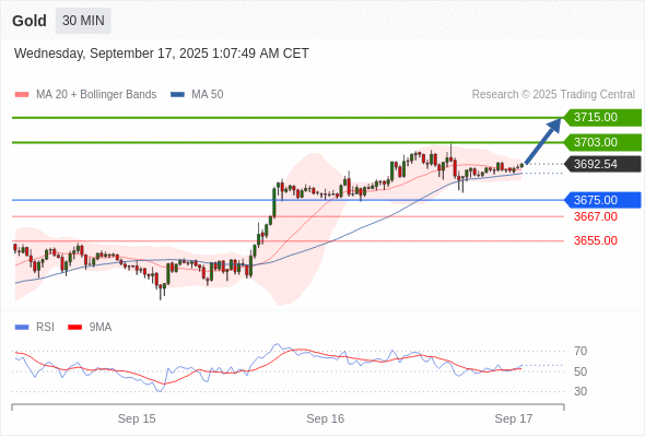 在 3675.00 之上,看涨,目标价位为 3703.00 ,然后为 3715.00 。