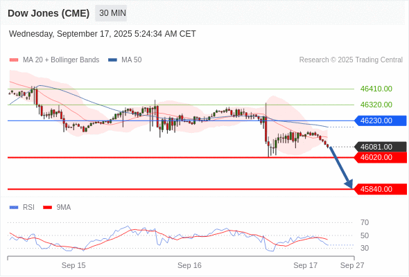 美国道琼斯指数期货 (Z5) 当日内: 短期关键阻力位在46230.00。