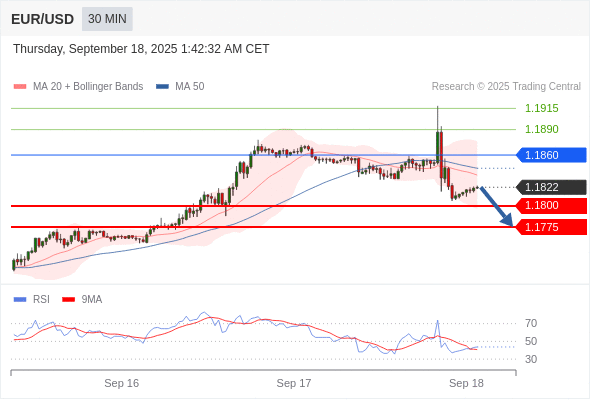 交易策略: 在 1.1860 之下,看跌,目标价位为 1.1800 ,然后为 1.1775 。