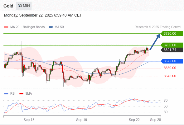 在 3672.00 之上,看涨,目标价位为 3700.00 ,然后为 3720.00 。