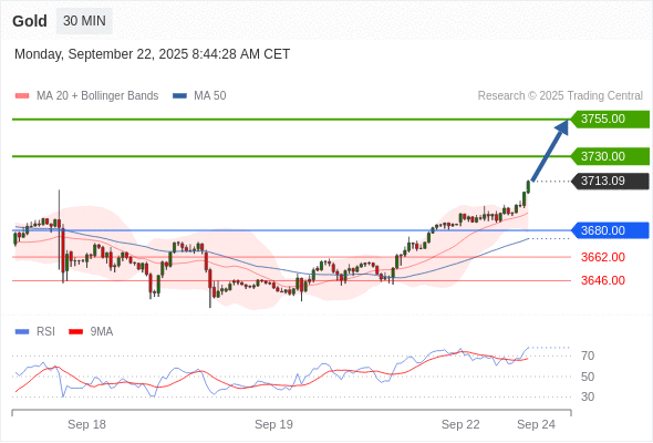 在 3680.00 之上,看涨,目标价位为 3730.00 ,然后为 3755.00 。