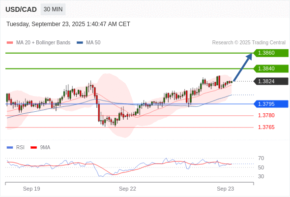 在 1.3795 之上,看涨,目标价位为 1.3840 ,然后为 1.3860 。