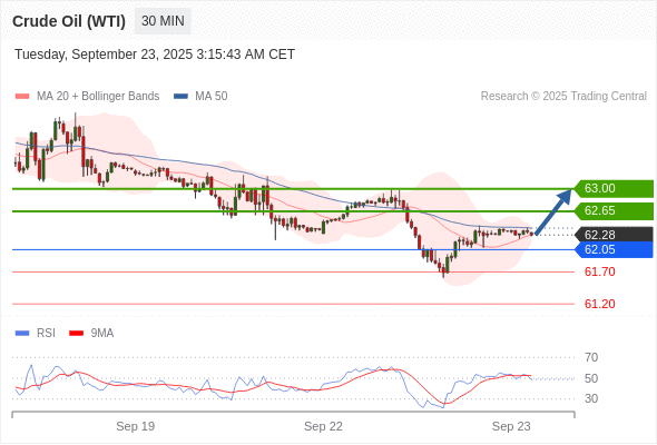 在 62.05 之上,看涨,目标价位为 62.65 ,然后为 63.00 。