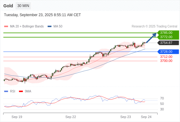在 3728.00 之上,看涨,目标价位为 3772.00 ,然后为 3785.00 。