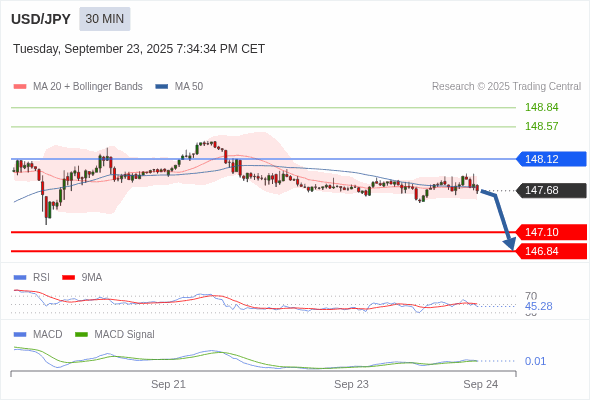 美元/日元 当日内 : 当 148.12 维持阻力位时,存在回归 146.84 的风险。