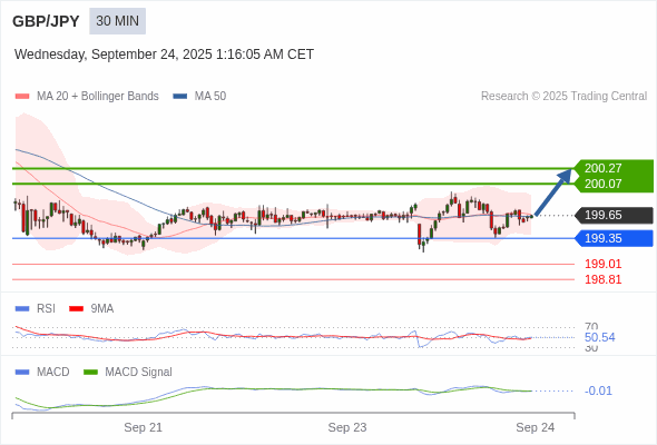 英镑/日元 当日内 : 调整至 199.35 处,在反弹上升之前。