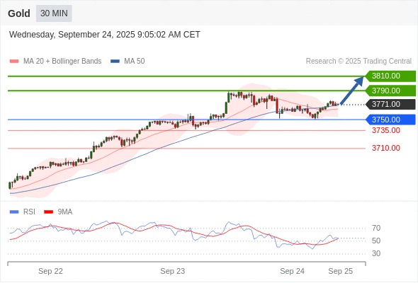 在 3750.00 之上,看涨,目标价位为 3790.00 ,然后为 3810.00 。