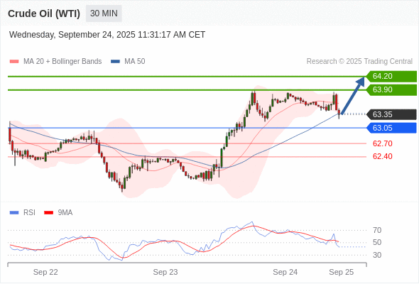 在 63.05 之上,看涨,目标价位为 63.90 ,然后为 64.20 。