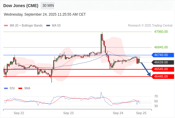 在 46740.00 之下,看跌,目标价位为 46545.00 ,然后为 46445.00 。