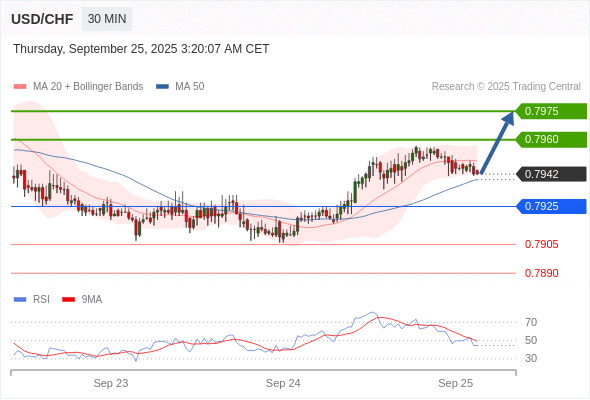 美元/瑞郎 当日内: 在0.7925之上,看涨。