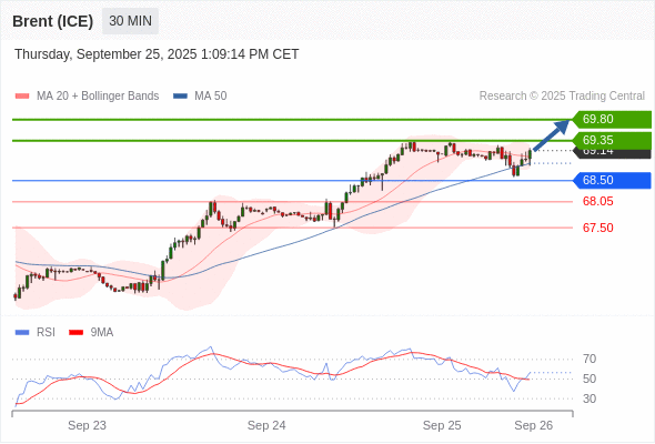 在 68.50 之上,看涨,目标价位为 69.35 ,然后为 69.80 。