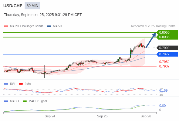 美元/瑞郎 当日内 : 看涨,当 0.7977 为支撑位,目标定在0.8050。
