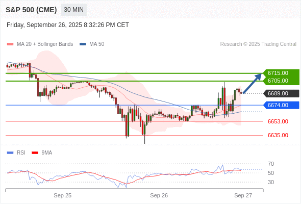 美国标普500指数期货 (Z5) 当日内: 超短线(当日内)支撑位在6674.00附近。