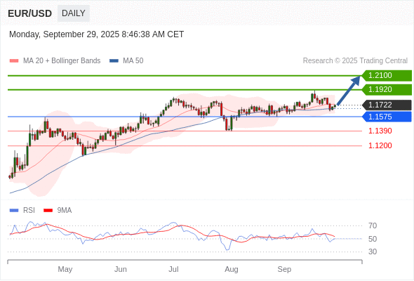 在 1.1575 之上,看涨,目标价位为 1.1920 ,然后为 1.2100 。