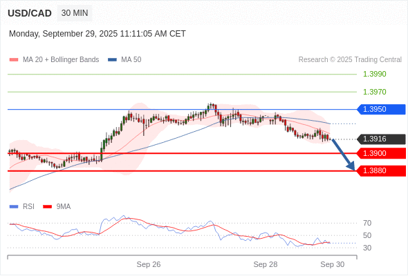 在 1.3950 之下,看跌,目标价位为 1.3900 ,然后为 1.3880 。