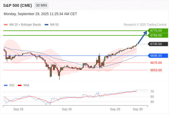 在 6696.00 之上,看涨,目标价位为 6756.00 ,然后为 6770.00 。