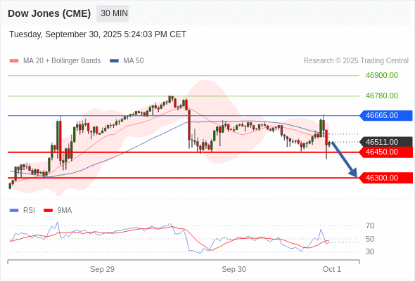 在 46665.00 之下,看跌,目标价位为 46450.00 ,然后为 46300.00 。