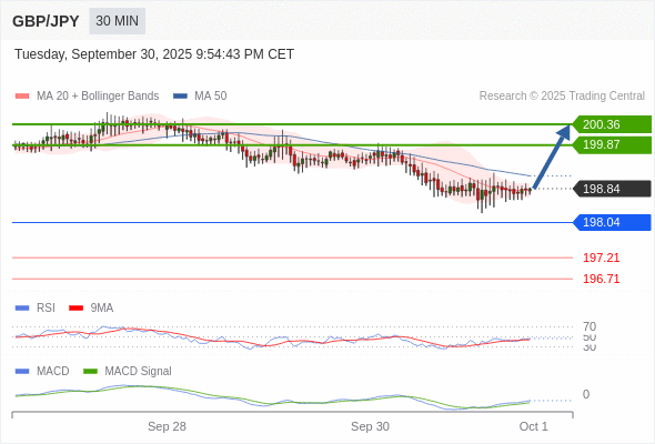 英镑/日元 当日内: 有上涨的可能,目标价位定在 200.36 。