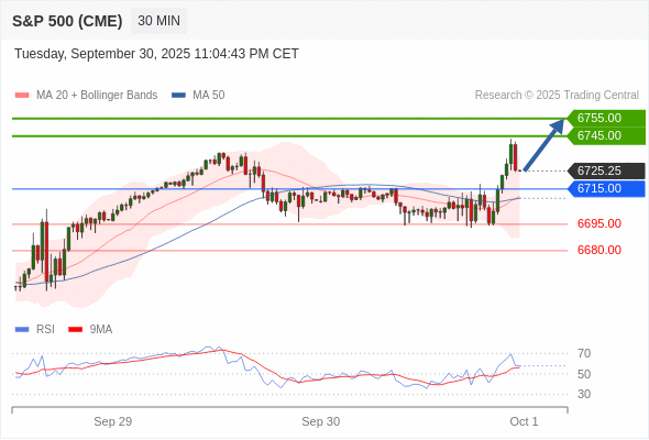 在 6715.00 之上,看涨,目标价位为 6745.00 ,然后为 6755.00 。