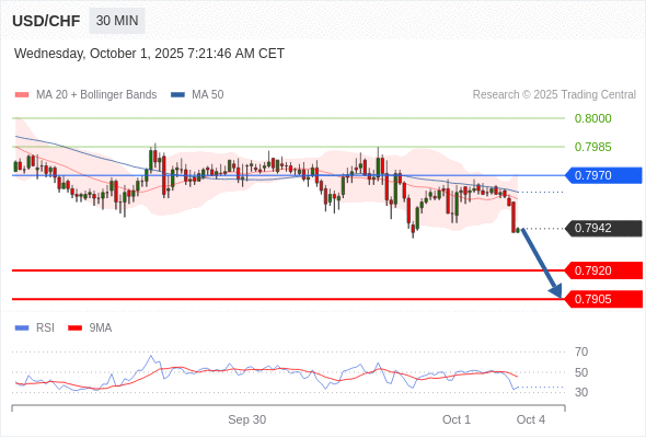 在 0.7970 之下,看跌,目标价位为 0.7920 ,然后为 0.7905 。