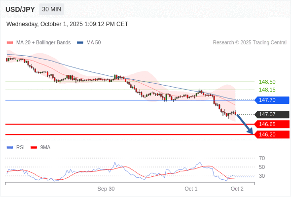 在 147.70 之下,看跌,目标价位为 146.65 ,然后为 146.20 。