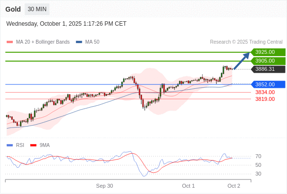 在 3852.00 之上,看涨,目标价位为 3905.00 ,然后为 3925.00 。