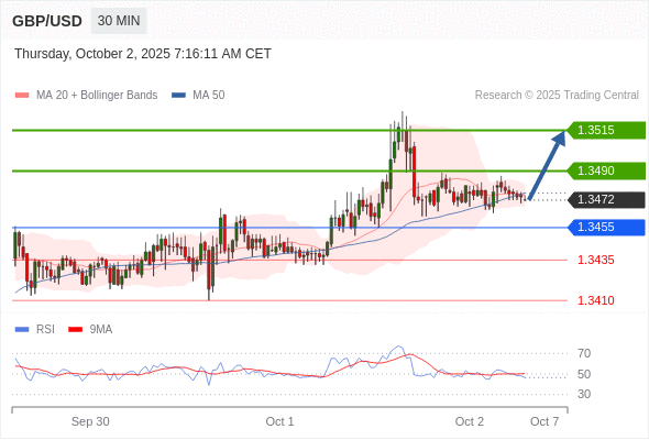 在 1.3455 之上,看涨,目标价位为 1.3490 ,然后为 1.3515 。