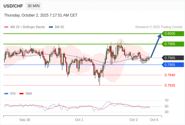 在 0.7955 之上,看涨,目标价位为 0.7985 ,然后为 0.8000 。