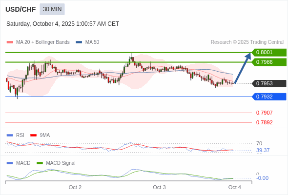 美元/瑞郎 当日内 : 有上涨的可能,目标价位定在 0.8001 。
