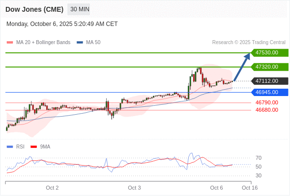 在 46945.00 之上,看涨,目标价位为 47320.00 ,然后为 47530.00 。