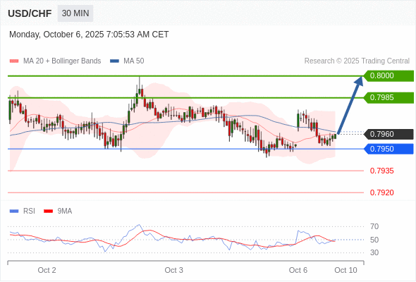 在 0.7950 之上,看涨,目标价位为 0.7985 ,然后为 0.8000 。