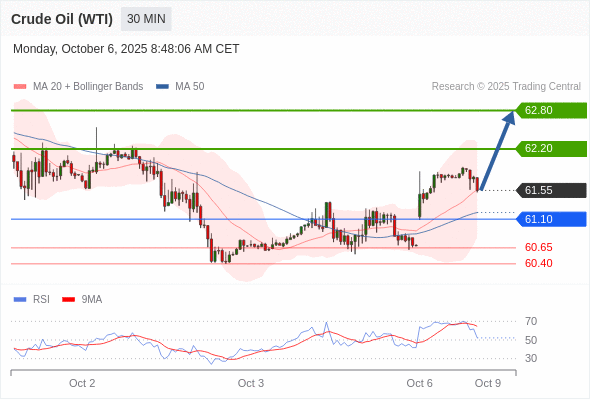 在 61.10 之上,看涨,目标价位为 62.20 ,然后为 62.80 。