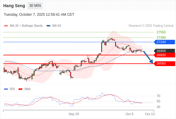 恒生指数 当日内: 目标位为26560。