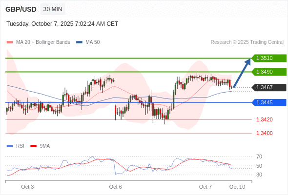 在 1.3445 之上,看涨,目标价位为 1.3490 ,然后为 1.3510 。