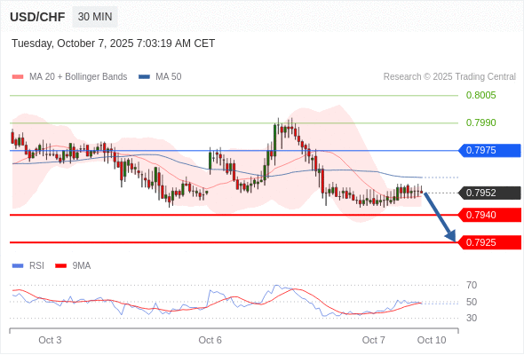 在 0.7975 之下,看跌,目标价位为 0.7940 ,然后为 0.7925 。