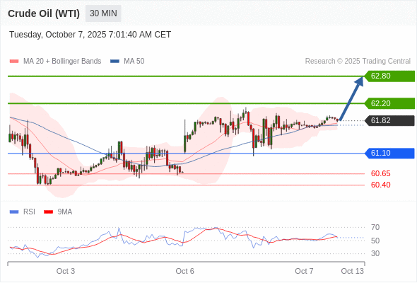 在 61.10 之上,看涨,目标价位为 62.20 ,然后为 62.80 。