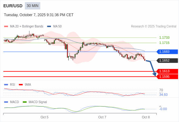 欧元/美元 当日内 : 看跌,在 1.1683 之下。