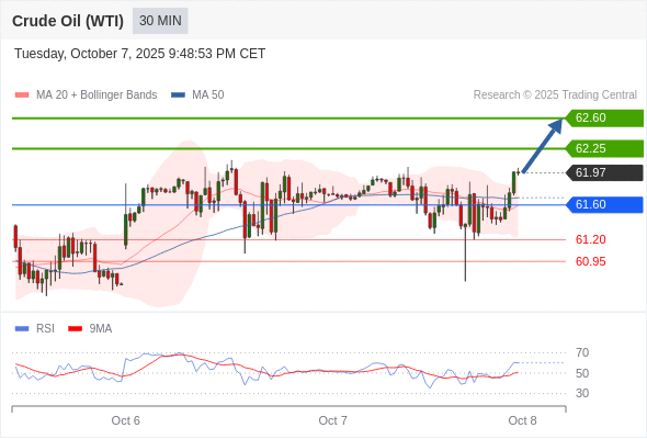 在 61.60 之上,看涨,目标价位为 62.25 ,然后为 62.60 。