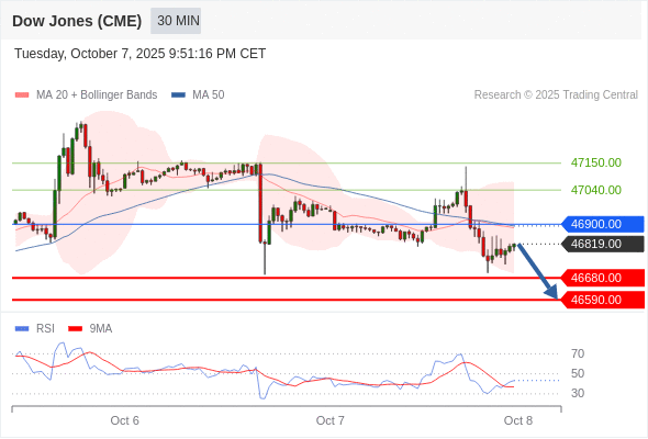 在 46900.00 之下,看跌,目标价位为 46680.00 ,然后为 46590.00 。