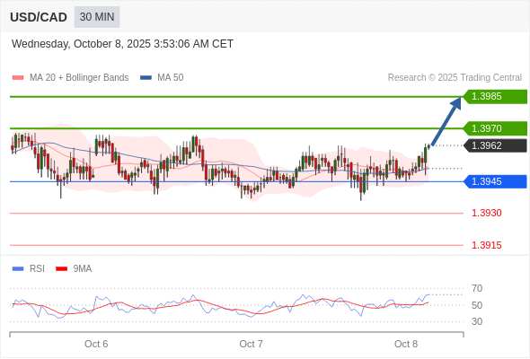 在 1.3945 之上,看涨,目标价位为 1.3970 ,然后为 1.3985 。