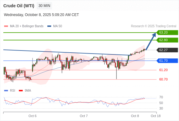 在 61.70 之上,看涨,目标价位为 62.80 ,然后为 63.20 。