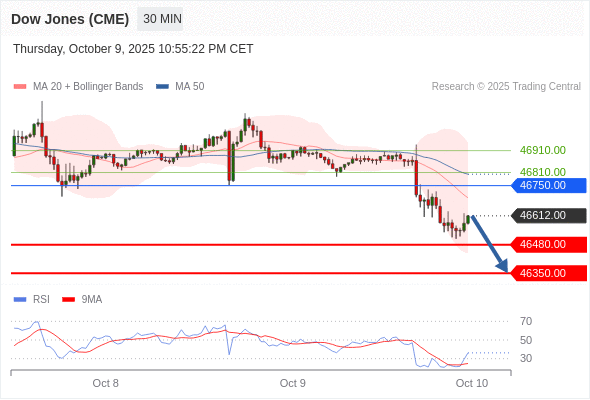 美国道琼斯指数期货 (Z5) 当日内: 短期关键阻力位在46750.00。